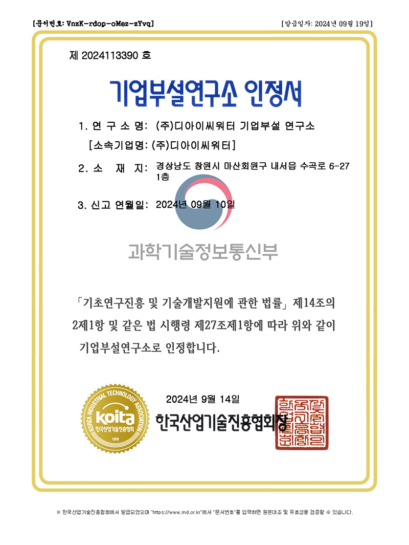 기업부설연구소 인정서 페이지 정보 작성자최고관리자 댓글 0건 조회 8회 작성일 25-07-25 17:18 본문 기업부설연구소 인정서 페이스북 공유 트위터 공유 SNS 공유 목록 이전글(주)디아이씨워터_벤처기업 확인증 25.07.25 다음글㈜디아이씨워터_ISO 9001(한글) 25.07.25 댓글목록 댓글목록 등록된 댓글이 없습니다.
